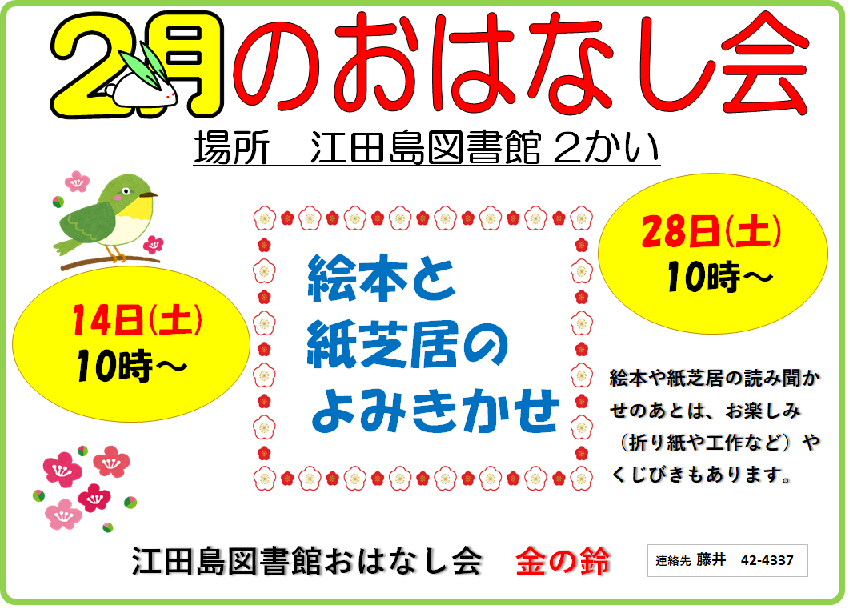 わしべおはなし会「金の鈴」によるおはなし会です。 絵本と紙しばいを読みます。読み聞かせの後は、工作など・・・ そしてお楽しみのくじびきもあります。 どうぞお気軽に参加してください。 開始時間は10時からです。